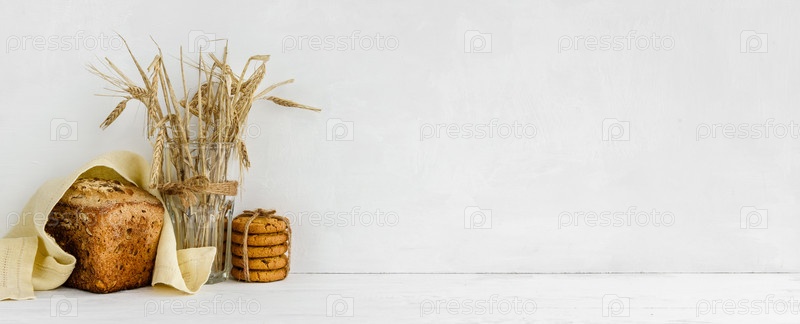 Баннер с белым фоном стены и копией пространства - домашний зерновой хлеб и льняная салфетка. Декор для домашней кухни