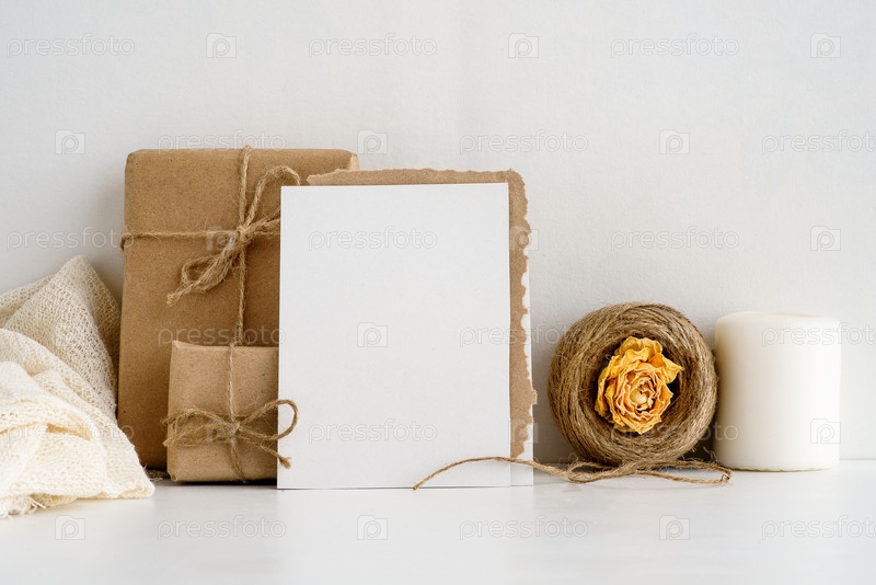 Фон канцелярских товаров моды на белом фоне. пустая открытка для надписей и подарков в крафт-бумаге. Свадебный фон. Пригласительная открытка