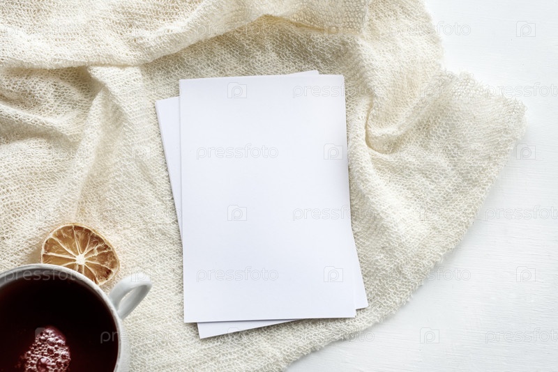 Сцена раскладки канцелярских товаров в светлом ключе. Пустая вертикальная открытка и белая чашка чая