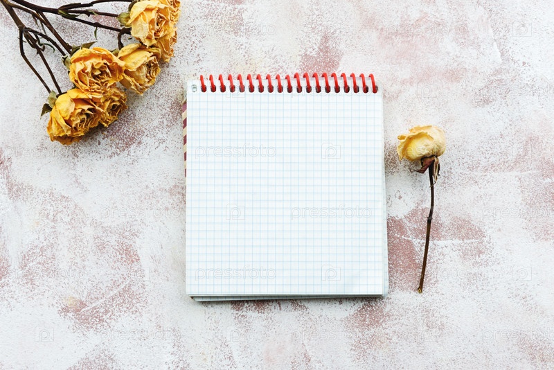 Чистый блокнот для записей на светлом нежном фоне и сухих цветах и травах. Канцелярские товары мягкий фон. Вид сверху, крупный план и пространство для копирования