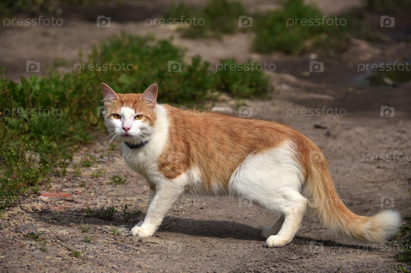 Рыжий большой кот на улице в траве