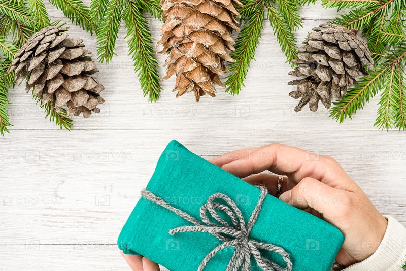 Новогодний фон. Рождественская композиция. Руки готовят новогодний подарок