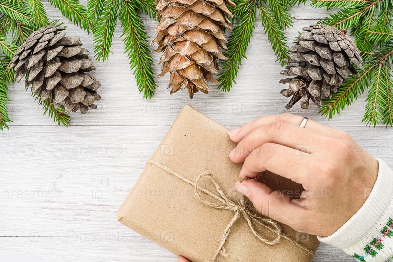 Новогодний фон. Рождественская композиция. Руки готовят новогодний подарок