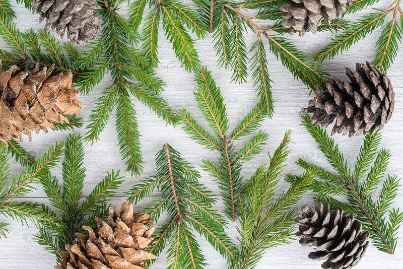 Вид сверху на рождественский деревянный фон из еловых веток и шишек