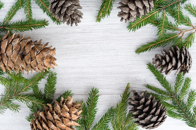 Рождественский фон - круглая рамка из еловых веток и шишек