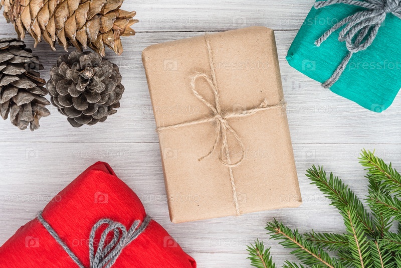 Рождественская композиция. Вид сверху на подарки, шишки и еловые ветки