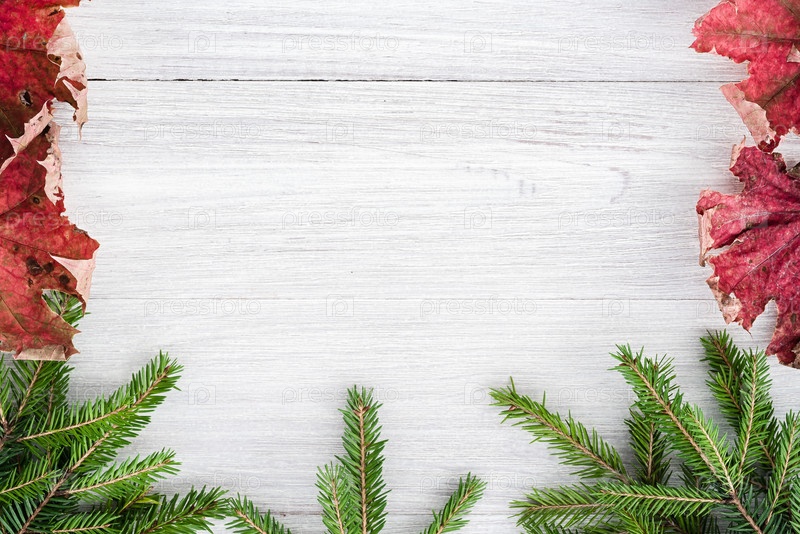 Вид сверху на рождественскую композицию. Рамка из шишек и еловых ветвей