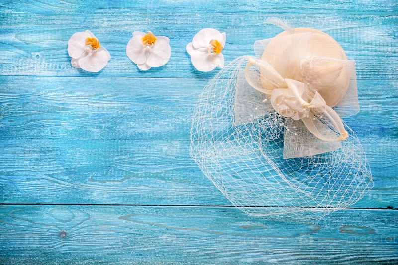 Элегантная женская шляпка на синем деревянном фоне Элегантная дамская шляпка на синем деревянном фоне