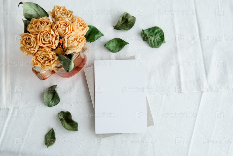 Модный белый фон и пустая открытка - белый фон, желтые розы и пространство для копирования. Романтическая открытка