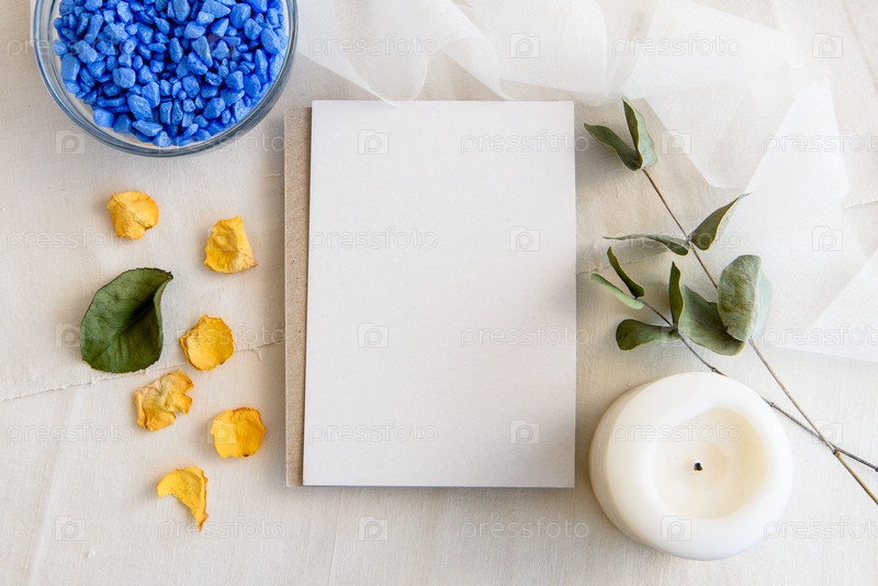 Летняя свадебная сцена макета канцелярских товаров. Пустая вертикальная открытка, конверт из крафт-бумаги и оливковые ветви, изолированные на белом фоне стола. Женственная средиземноморская квартира, вид сверху