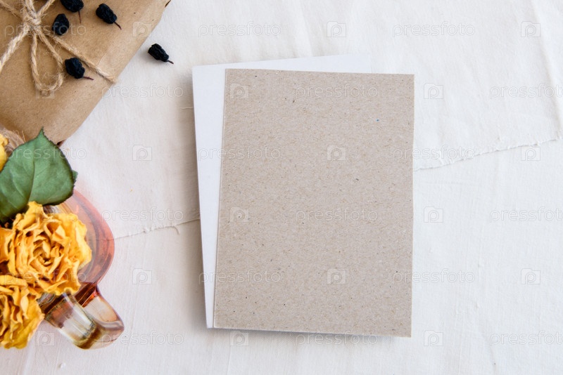 Пустая вертикальная открытка, нитка жемчуга и сушеные цветы, изолированные на белом фоне стола. Вид сверху бланк для приглашения