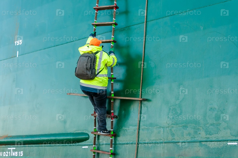 Россия, Санкт-Петербург, май 2021 г.: Геодезист поднимается по лестнице на борт нефтяного танкера