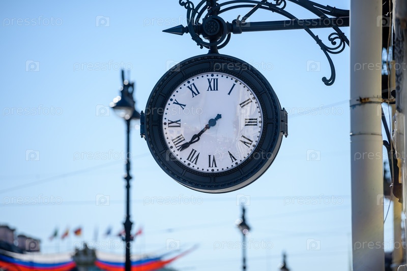 Россия, Санкт-Петербург, 23 мая 2020 года: большие настенные уличные часы в стиле ретро