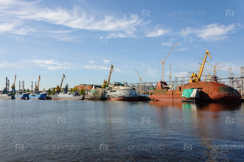 Россия, Санкт-Петербург, май 2021 г.: Морской грузовой порт, краны и корабли
