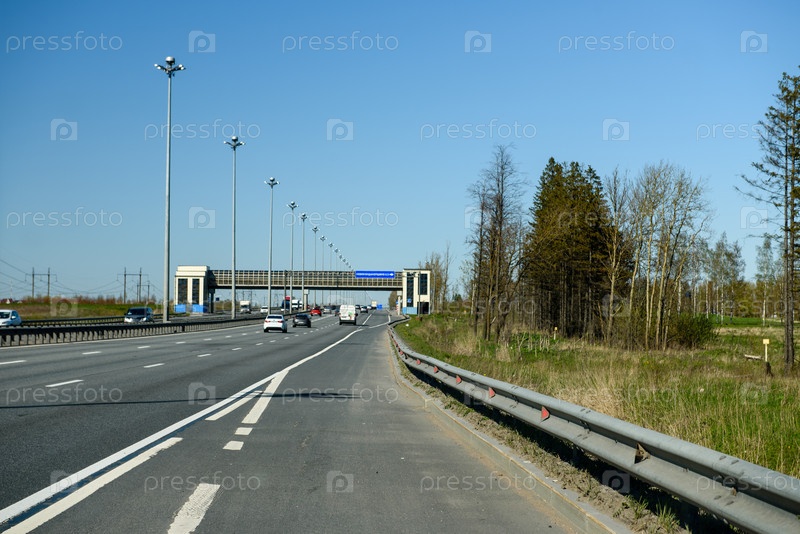 Россия, Гатчина, 23 мая 2020 года: автомобильное шоссе и движущиеся по нему автомобили