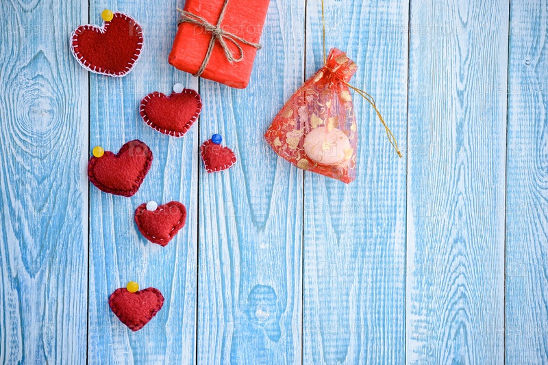 Красивый синий деревянный фон с красными сердечками. Лучшая открытка ко Дню святого Валентина