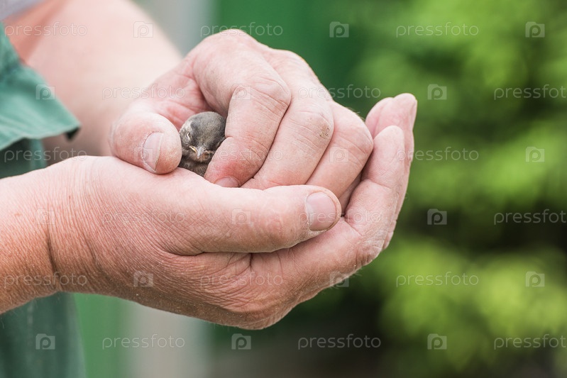 Рука мужчины держит выпавшего из гнезда птенца