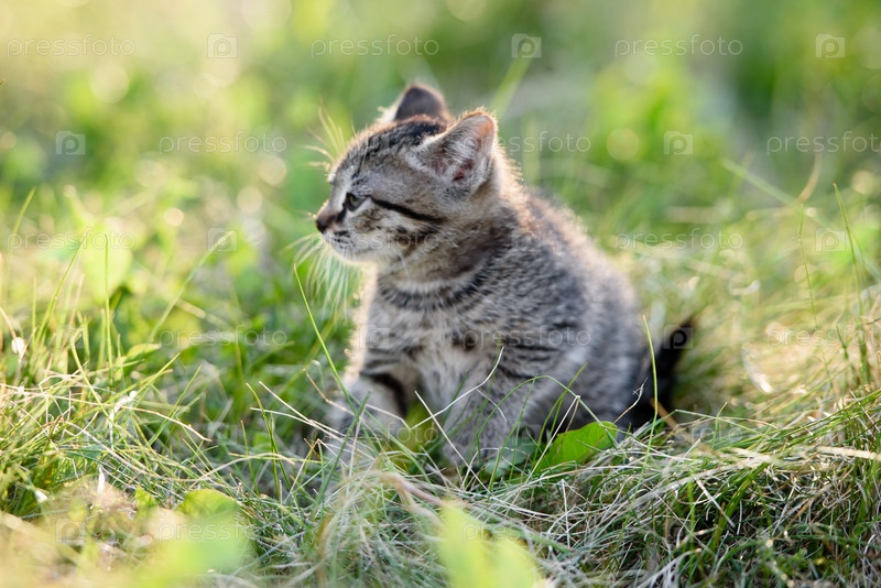 Маленький очаровательный котенок гуляет по зеленой траве