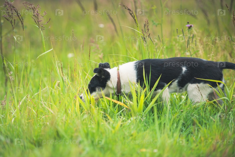 Счастливый щенок в траве в солнечный летний день