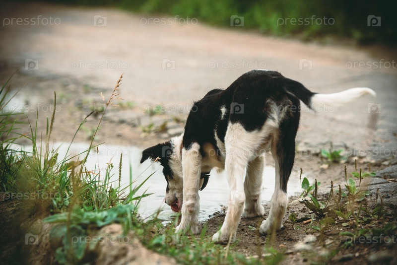 Счастливый молодой щенок пьет из лужи летом, Санни да