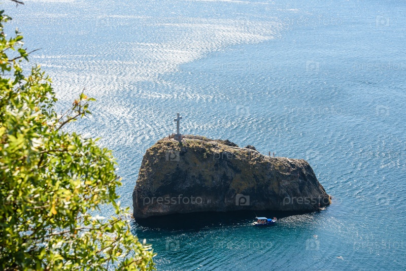 Крым, Балаклава, 15 сентября 2019 г.: вид сверху на Черное море. Морской пейзаж летом