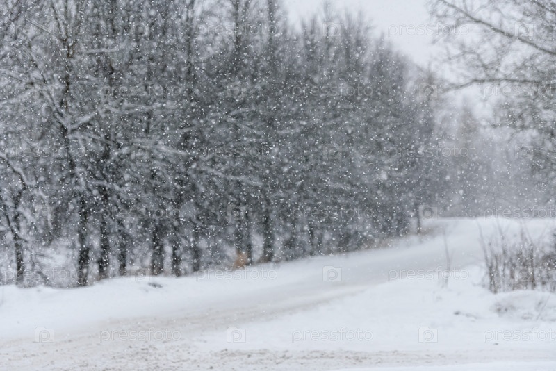 Снегопад зимой - зимний день. Падающий снег на размытом фоне природы