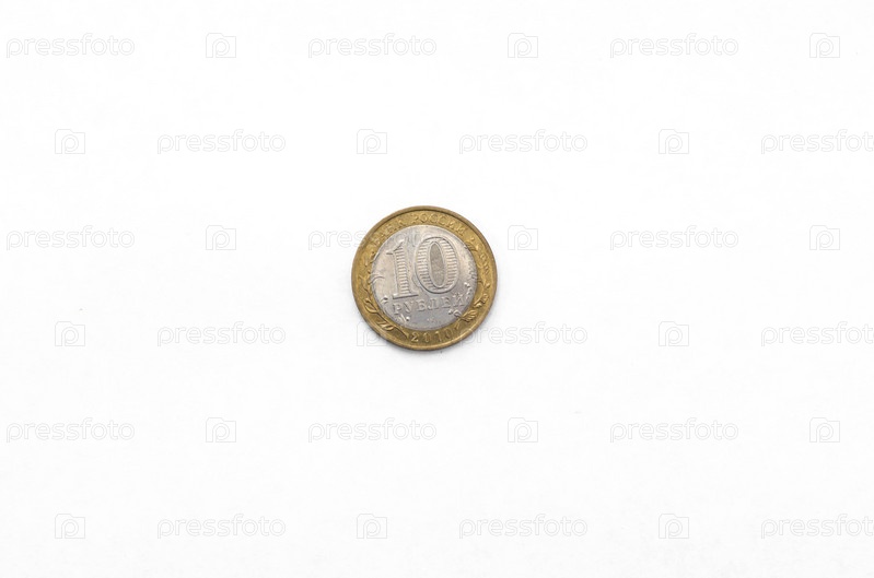 Денежные монеты на столе - российский рубль на белом