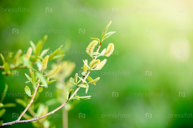 Зеленые листья на ветке крупным планом. Красивый летний фон. Солнечный свет