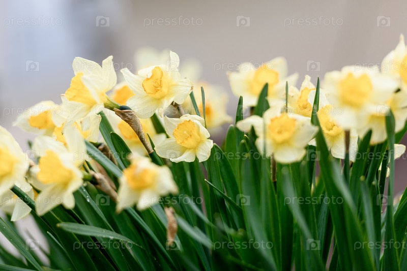 Цветы нарциссов в саду крупным планом. Летний пейзаж и природа