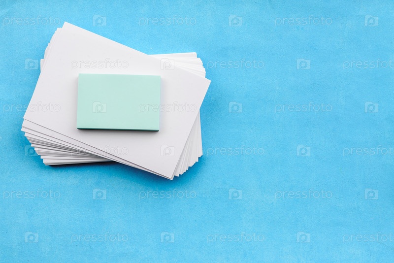 Макет канцелярских товаров на синем фоне — стопка пустых белых карточек, наклеек и будильник