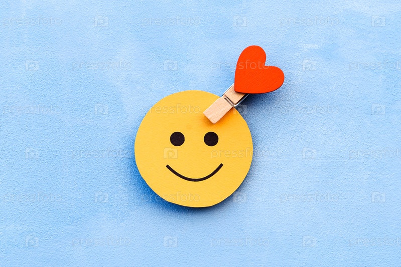 Желтый счастливый смайлик на синем фоне и красное сердце в качестве выбора эмоций. Концепция выбора настроения и обратной связи с клиентами. Копирование пространства, бизнеса и эмоций