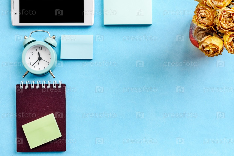 Вид сверху на офисный стол с канцелярскими принадлежностями. Макет