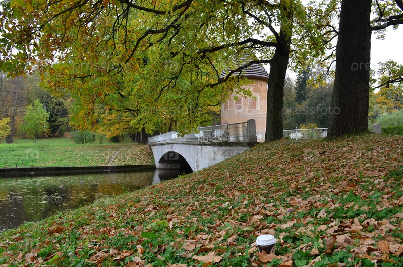Пиль-башня в Павловском парке осенью. Кофе в осенней листве