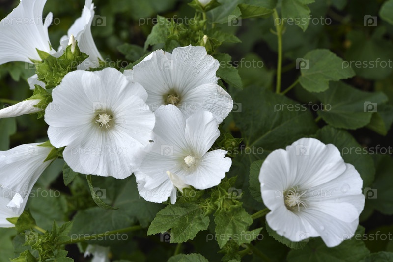 Белые цветы лавата в летнем зеленом саду. Лаватера триместрис