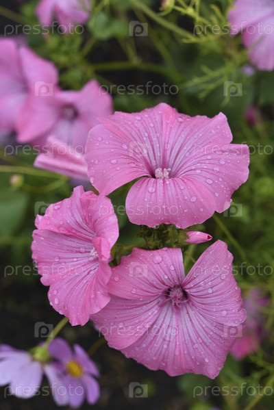 Розовые цветы лавата в летнем зеленом саду. Лаватера триместрис