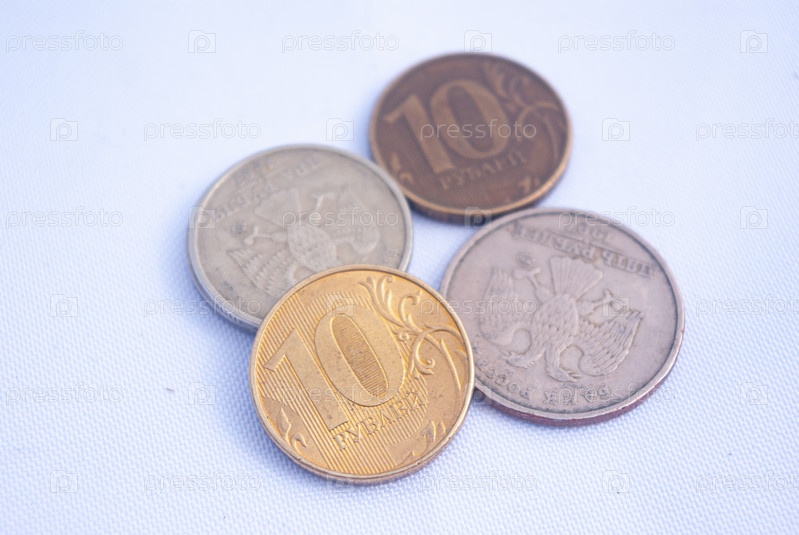Монеты 10 рублей, железо, российские деньги на белом фоне
