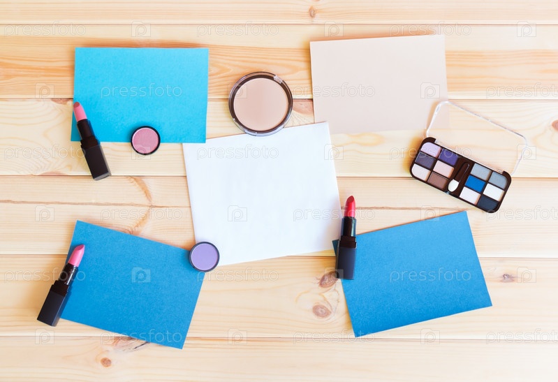 Бумажные карточки и косметика для макияжа на деревянном фоне