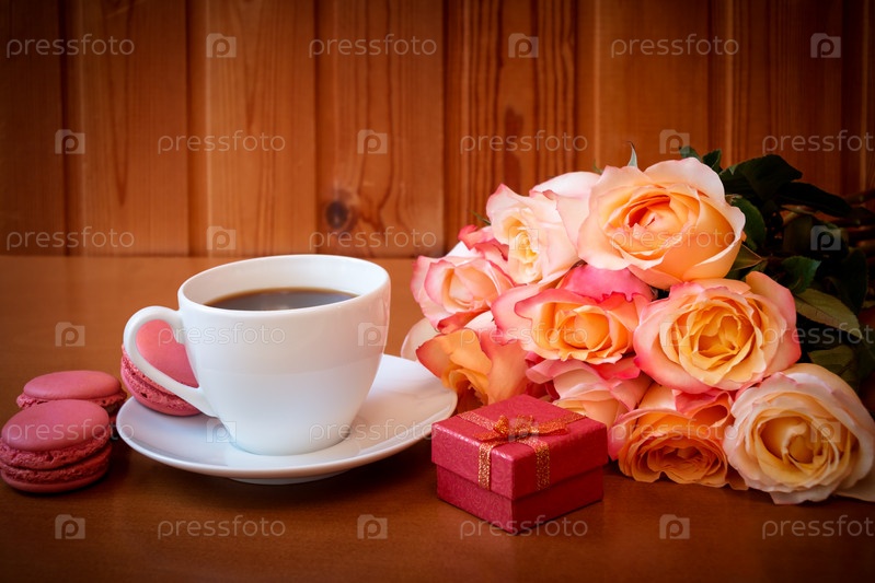 Чашка кофе, букет розовых роз и красная подарочная коробка. Селективный фокус. Место для текста