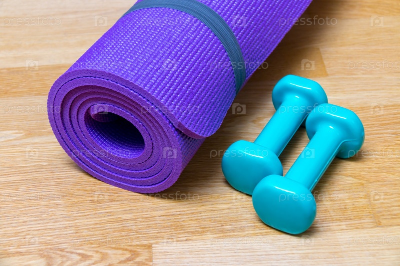 Коврик для йоги и гантели на деревянном полу. Селективный фокус