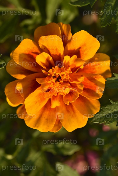 Оранжевые цветы бархатцев в летнем саду. Бархатцы прямостоячие. Лекарственное растение