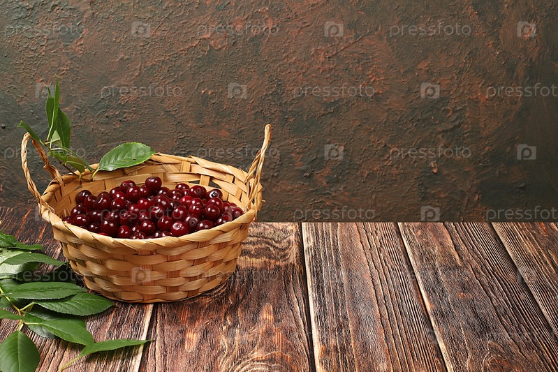 Летние вишневые ягоды в корзинах на деревянном фоне, сбор урожая в деревне, концепция здорового натурального питания, завтрак с ингредиентами, реклама магазина, визитная карточка кафе,