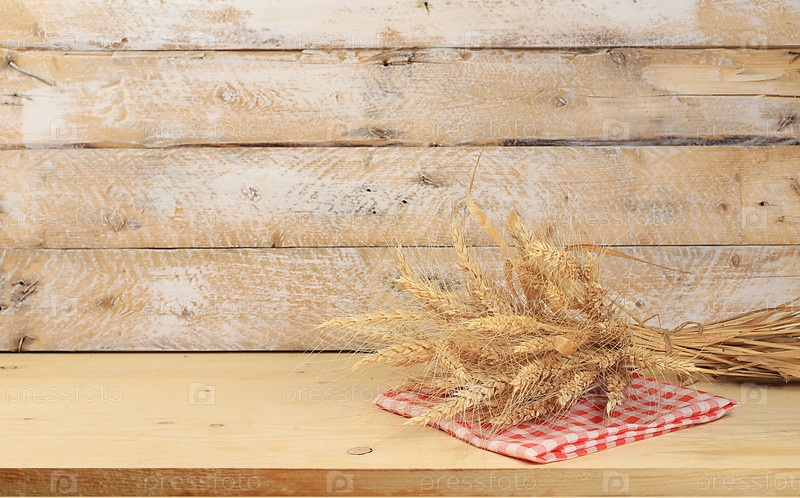 Пустой деревянный стол со снопом пшеницы на старом фоне, деревенский стиль, концепция сбора урожая, эко-концепция, кухонный макет для дизайна и витрина демонстрации продукции, выборочный фокус