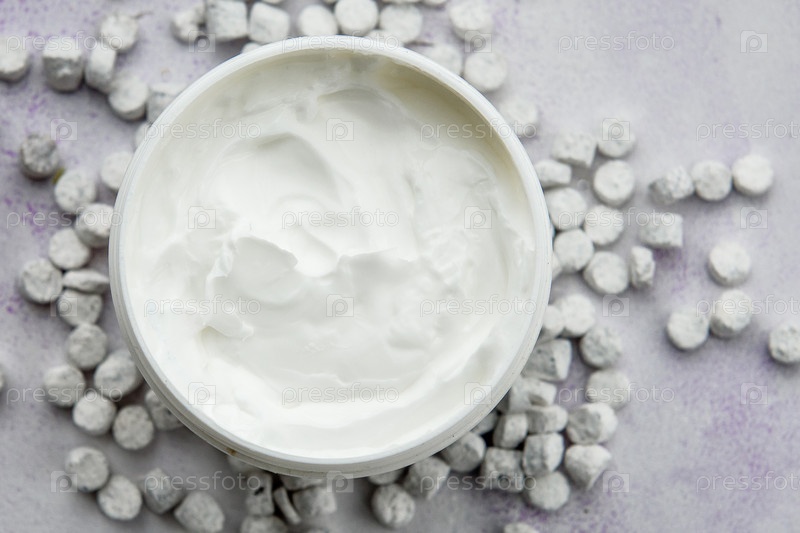 Крупный план гладкого увлажняющего крема в пластиковой банке на синем фоне с белыми мелкими камушками сверху. Концепция ухода за кожей