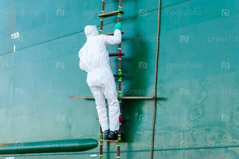 Россия, Санкт-Петербург, май 2021 г.: Геодезист поднимается по лестнице на борт нефтяного танкера