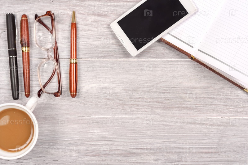 Вид сверху стола с чашкой кофе, смартфоном и ноутбуком