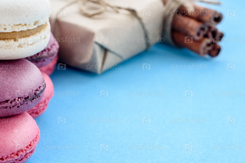 Французские макароны на синем фоне. Модный десерт. Сладкие пирожные