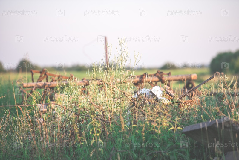 Старый плуг в поле во время сбора урожая