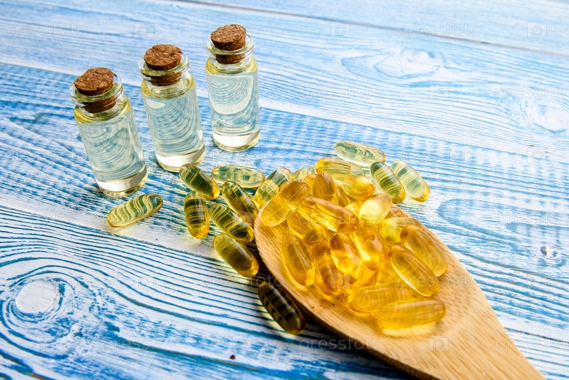Капсулы рыбьего жира на синем фоне - витамины омега-3 и концепция здоровья