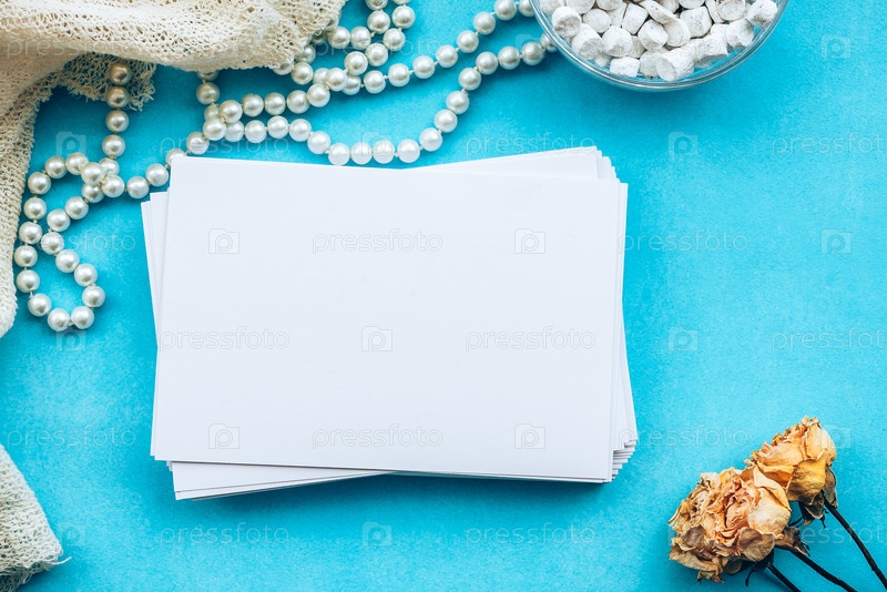 Белые пустые карточки и желтые розы на синем фоне. Нежная романтическая заготовка для открытки. Приглашение на свадьбу и место для копирования, вид сверху