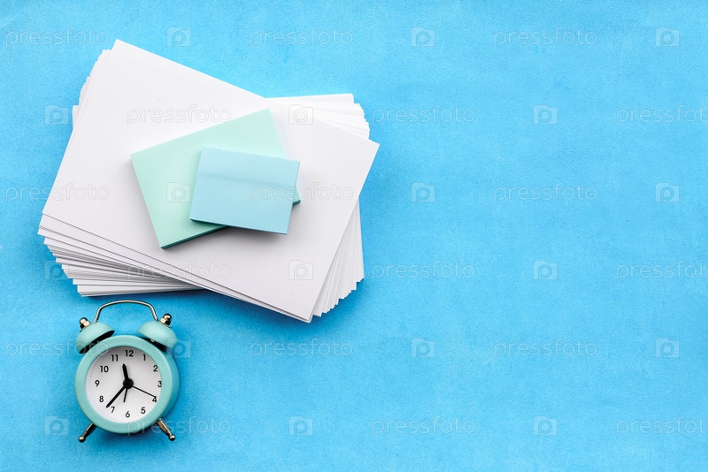 Макет канцелярских товаров на синем фоне — стопка пустых белых карточек, наклеек и будильник